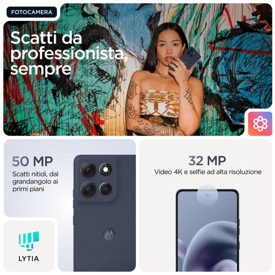 Presentiamo Moto g86 5G, pensato per chi si spinge oltre i propri limiti. Realizzato con materiali di alta qualità, si distingue per il design grintoso con protezione avanzata contro acqua e cadute(6,7). Visualizza tutti i tuoi contenuti su uno schermo Super HD super luminoso (1220p) da 6,67" con audio Dolby Atmos®. Scatta foto meravigliose con la fotocamera Sony LYTIA? 600 da 50 MP con Moto AI(12) e realizza video da professionista. Ottieni una durata della batteria superiore a 41 ore in pochi minuti con la ricarica TurboPower?(1,13). Senti tutta la potenza di un processore avanzato, di una RAM di 8 GB espandibile fino a 24 GB con l'Estensione RAM, e di uno spazio di archiviazione fino a 256 GB (3,9). Esalta la tua libertà creativa, interagisci con assoluta facilità e muoviti in tutta tranquillità con le esclusive funzionalità Moto. Vivi appieno tutte le avventure della vita con Moto g86 5G.