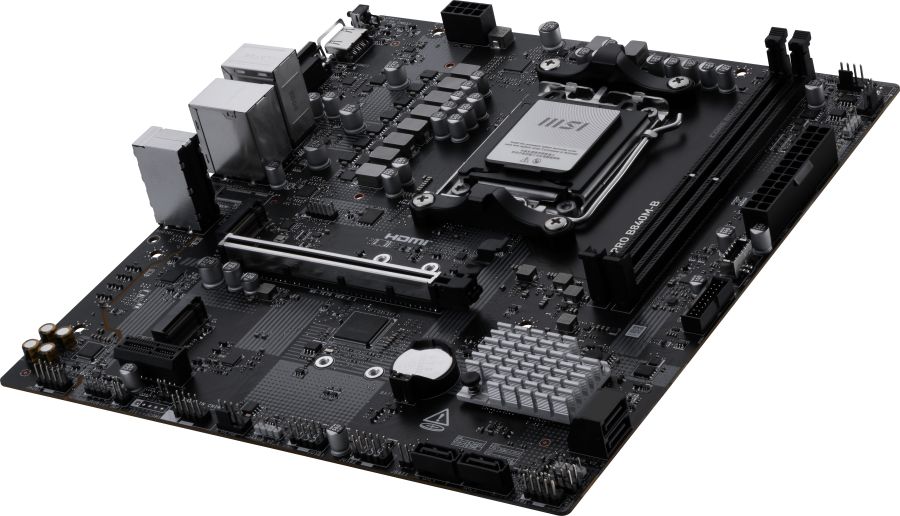 Desktop Motherboard MSI PRO B840M-B 911-7E76-002 007E76-002RPRO B840M-B. Produttore processore: AMD, Presa per processore: Socket AM5, Processori compatibili: AMD Ryzen 7000 Series, AMD Ryzen 8000 Series, AMD Ryzen 9000 Series. Tipi di memoria supportati: DDR5-SDRAM, RAM massima supportata: 128 GB, tipo di slot di memoria: DIMM. Interfacce dell'unità di archiviazione supportate: M.2, Micro SATA III, Tipi di unità di archiviazione supportate: HDD & SSD, Livelli RAID: 0, 1, 10. Tipo di interfaccia Ethernet: 2.5 Gigabit Ethernet, Controller LAN: Realtek RTL8125D. Componente per: PC, Fattore di forma scheda madre: micro ATX, Famiglia di chipset per scheda madre: AMD