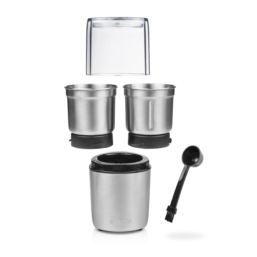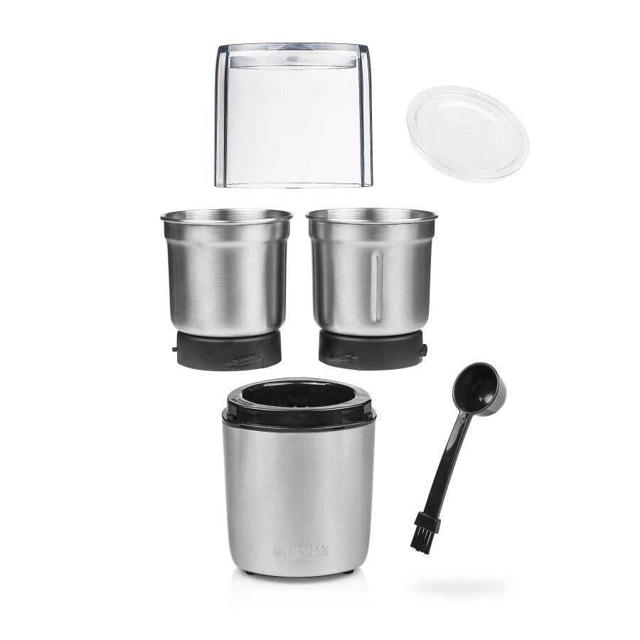Due recipienti rimovibili in acciaio inox per tritare aglio e erbe fresche e uno per macinare chicchi di caffè e spezie