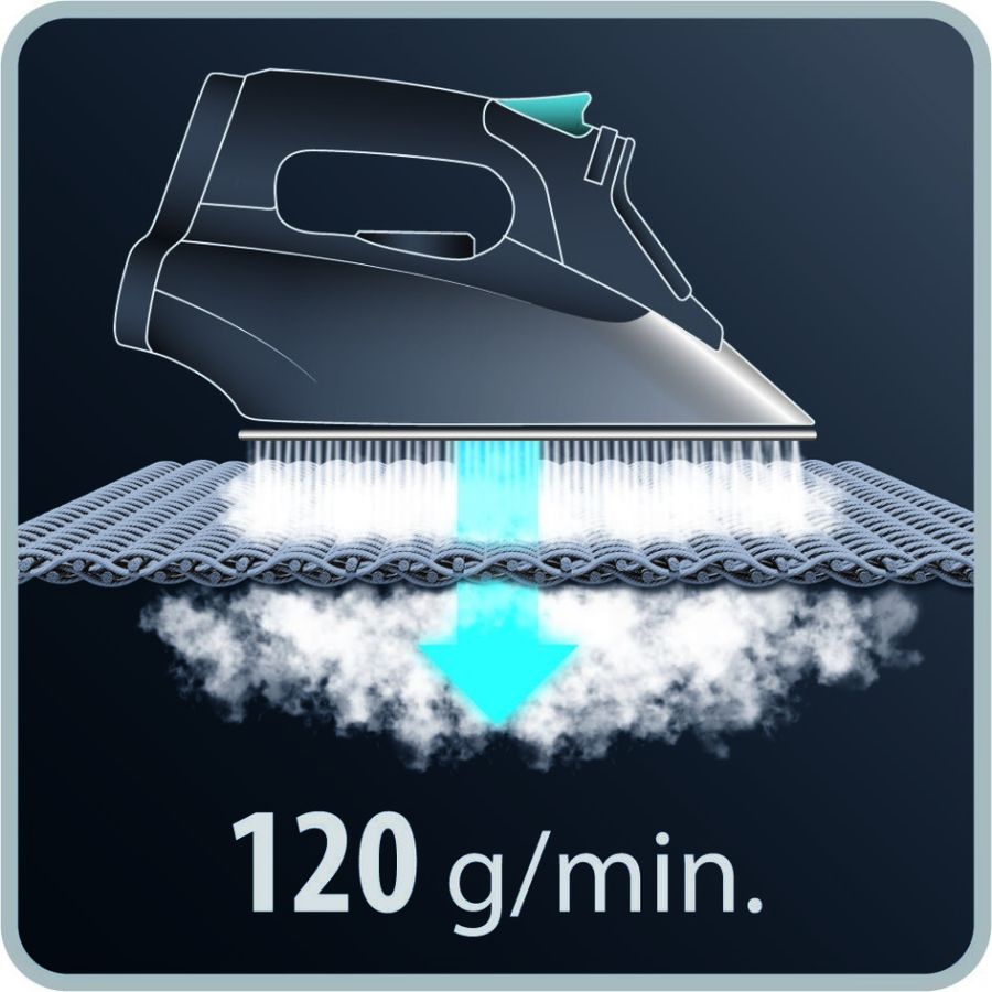 L'intensa potenza del colpo vapore da 120 g/min elimina le sgualciture dai tessuti spessi e le