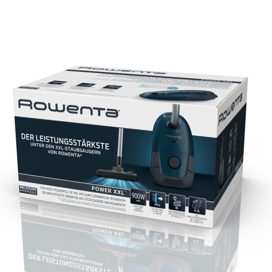 Aspirapolvere Rowenta RO3126 ECO143231Power XXL RO3126. Massima potenza in entrata: 900 W. Tipo: A cilindro, Tipo di pulizia: Secco, Tipo di contenitore della polvere: Sacchetto per la polvere, Capacità del contenitore: 4,5 L. Sistema di filtraggio dell'aspirapolvere: Filtro igienico, Metodo di separazione dello sporco: Filtro, Emissione acustica: 76 dB. Colore del prodotto: Blu