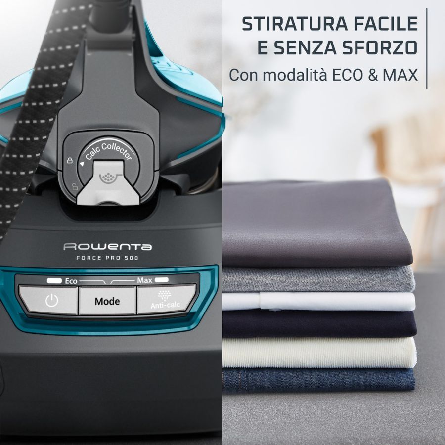 Il generatore di vapore Rowenta Force Pro 500 unisce un potente getto di vapore a un design intuitivo, per garantire risultati impeccabili su ogni tessuto La pressione di 8 bar elimina le grinze in un attimo, mentre il colpo di vapore da 600 g/min affronta con facilità anche le pieghe più ostinate. Attiva la modalità Eco per risparmiare fino al 50% di energia e vivi un?esperienza di stiratura ottimizzata grazie alle impostazioni semplificate (ECO e MAX), selezionabili direttamente dalla base ? senza bisogno di regolare manualmente la temperatura.*