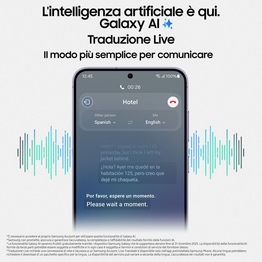 Prova un?esperienza di ricerca online mai vista prima con Cerchia e cerca1, ottieni una traduzione in tempo reale di una chiamata2, riassumi i tuoi appunti e riorganizzali in modo chiaro3 e modifica le tue foto da professionista4- tutto con l'AI. Grazie alle dimensioni più grandi del display e alle cornici ultrasottili5, il display FHD+ da 6,2""6 di Galaxy S24 ti offre un'esperienza di visione totalmente immersiva. Scatta foto straordinarie con dettagli definiti, a più livelli di zoom e cogli ogni dettaglio grazie alla nuova soluzione AI Zoom.7 ll nuovo Armor Aluminum migliorato mantiene protetto il tuo smartphone8 e con la certificazione IP689 per la resistenza all?acqua e alla polvere, Galaxy S24 è protetto anche durante le tue avventure più selvagge. Non farti fermare durante la giornata grazie alla batteria intelligente ad autonomia elevata.10