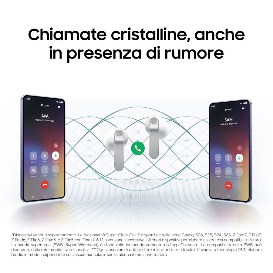 Auricolari wireless. Samsung R540NZKAI AURIC.GALAXY BUDS BLACK DICUFSAMR540NZKAIGli auricolari Galaxy Buds4 offrono un?esperienza intelligente e immersiva. Grazie ai movimenti intuitivi come annuire o scuotere la testa, puoi rispondere rapidamente a chiamate e conversazioni senza alzare un dito, anche quando le mani sono occupate. L?Interprete Galaxy AI traduce in tempo reale tutto ciò che ascolti sullo smartphone Galaxy, abbattendo le barriere linguistiche e garantendo comunicazioni chiare tra lingue diverse. Il design premium in metallo assicura comfort ergonomico per lunghe sessioni di ascolto, mentre l?Ultra High Quality Audio fino a 24-bit/96 kHz e la tecnologia DNN offrono suono dettagliato e chiamate cristalline anche in ambienti rumorosi. La custodia compatta e trasparente permette di verificare facilmente la ricarica, mentre la cancellazione totale del rumore regolabile con gesti o app Galaxy Wearable completa un?esperienza pratica e senza compromessi.