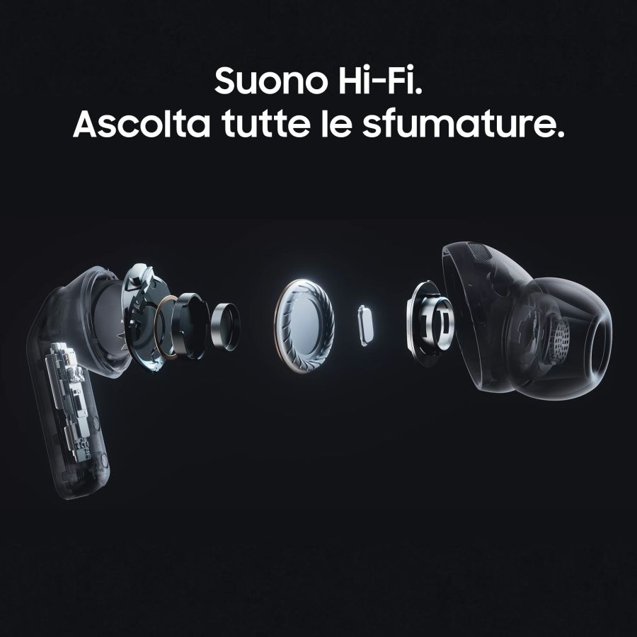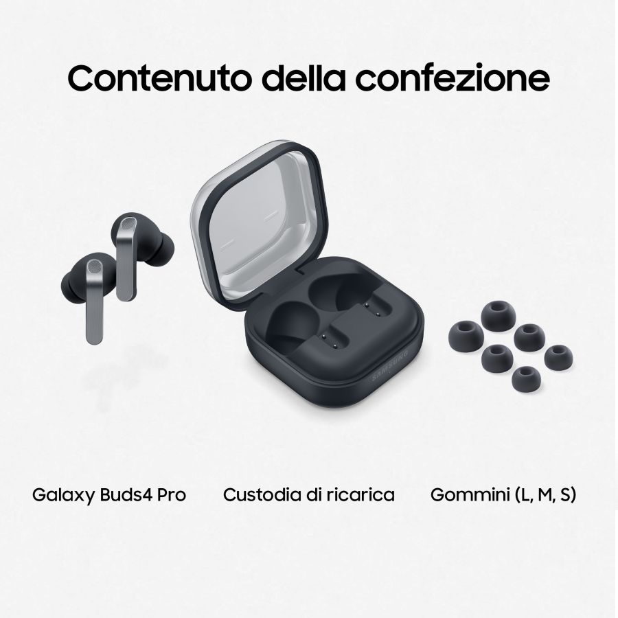 Auricolari wireless. Samsung SM-R640NZK AURICOLARI BT TWS BUDS 4 PRO BK DICUFSAMR640NZKAICon Galaxy Buds4 Pro vivi un?esperienza smart e senza interruzioni. Grazie ai cenni e ai movimenti intuitivi puoi gestire chiamate e funzioni con Galaxy AI senza alzare un dito, perfetto quando hai le mani occupate o non puoi parlare. L?Interprete potenziato da Galaxy AI ti aiuta a superare le barriere linguistiche: ascolti la traduzione direttamente negli auricolari e leggi sul tuo smartphone Galaxy, per comunicazioni sempre chiare. Il design premium in metallo unisce eleganza e comfort ergonomico, ideale per tutto il giorno. Il sofisticato altoparlante a 2 vie con doppi amplificatori riduce le distorsioni e offre un suono ricco e bilanciato. Con l?Ultra High Quality Audio fino a 24-bit/96 kHz ogni dettaglio prende vita, mentre la tecnologia DNN e la Banda Superlarga assicurano chiamate cristalline anche in ambienti rumorosi. Compatte e pratiche, con custodia trasparente, sono pensate per seguirti ovunque.