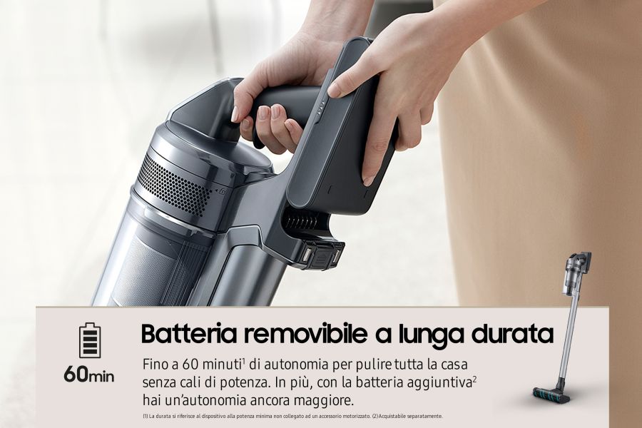 Pulisci la tua casa senza sforzo e con il massimo controllo. Il design ultra leggero assicura la massima praticità e riduce il rischio di traumi al polso. Il corpo della scopa pesa appena 1,66 kg, il 12% in meno[7] rispetto ai tradizionali aspirapolvere Samsung. In questo modo puoi pulire facilmente tutta la casa.