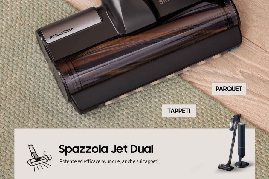 Il morbido rullo del sistema Jet Dual[10] aiuta ad aspirare le particelle di polvere[11] dalle superfici dure, per una pulizia impeccabile di tutti i tipi di pavimento. Inoltre, ruotando a 4.000 giri/min[12] , le setole in nylon e gomma rimuovono efficacemente peli e capelli anche dai tappeti. La testa ruota di 180° per cambiare facilmente direzione e il rullo si rimuove con un solo clic.