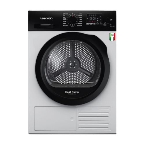 Asciugatrice a pompa di calore inverter, colore bianco, capacità 9 kg, display digitali con digit, programma intensivo (Eco Dry), motore inverter, classe energetica A+++, misure H844xL596xP630 mm.