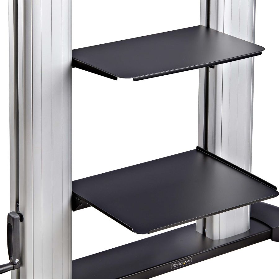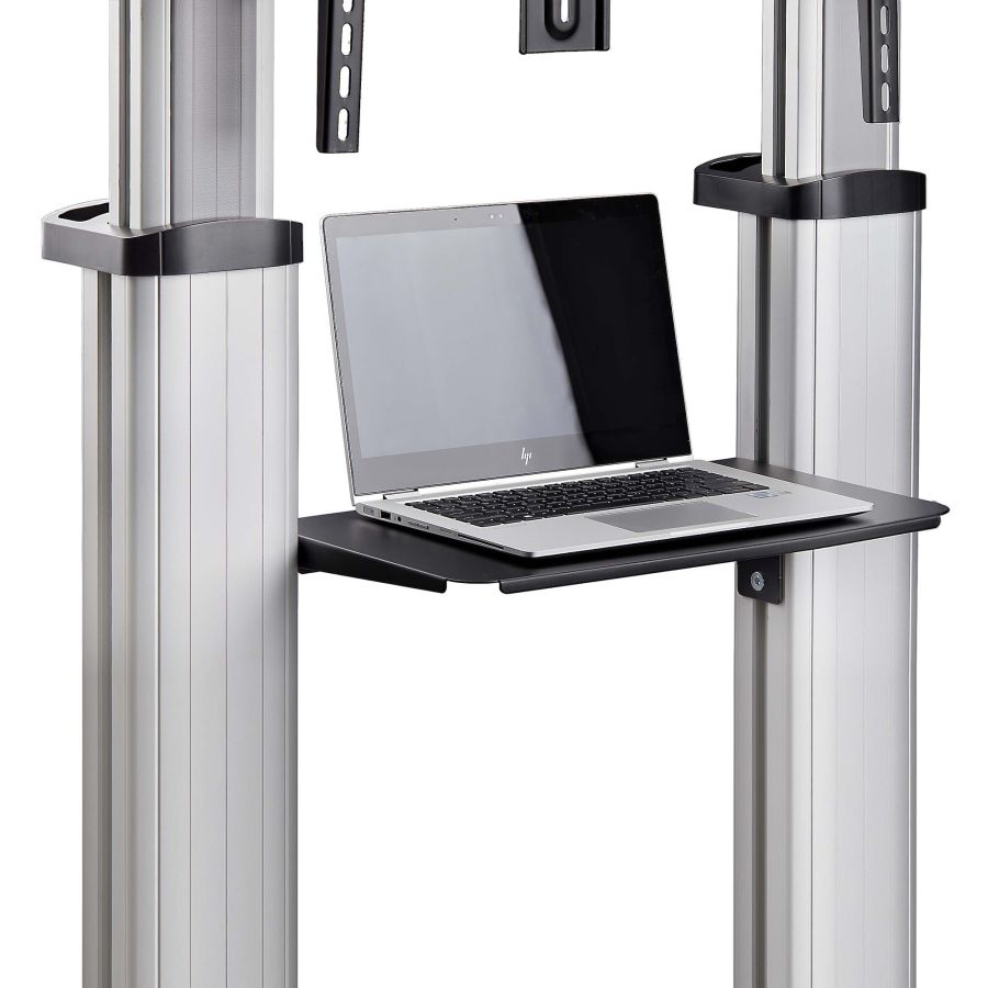 Per una maggiore portabilità e personalizzazione, questo carrello mobile è dotato di due ripiani per supporti regolabili in altezza in modo indipendente sotto il display, che possono supportare fino a 5 kg ciascuno. Il ripiano per la webcam, situato nella parte superiore del display, può essere sollevato fino a 2366 mm dal pavimento.