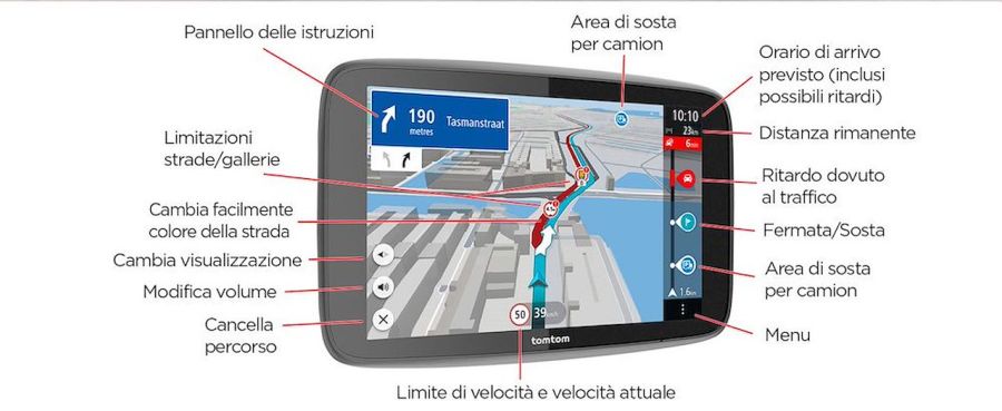 Trovarti su una strada, galleria o su un ponte non adatti al tuo veicolo non è mai divertente e potrebbe farti ritardare. Ecco perché TomTom GO Expert Plus personalizza ogni percorso in base alle dimensioni del tuo veicolo. Vai su "Impostazioni" nel menu principale, tocca "Il mio veicolo" e tocca ogni impostazione per inserire le informazioni del tuo veicolo.