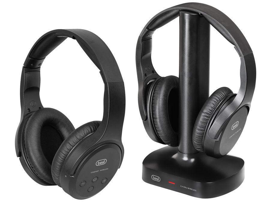 Auricolari Wireless per telefono Trevi FRS1580TW ECO139384Trevi FRS 1580 TW è un set formato da 2 cuffie wireless per TV ricaricabili ed una base/trasmettitore, con cui due persone potranno ascoltare contemporaneamente l?audio proveniente da qualsiasi apparecchio dotato di presa cuffia o uscita ottica come televisori, impianti Hi-Fi e lettori Mp3.
