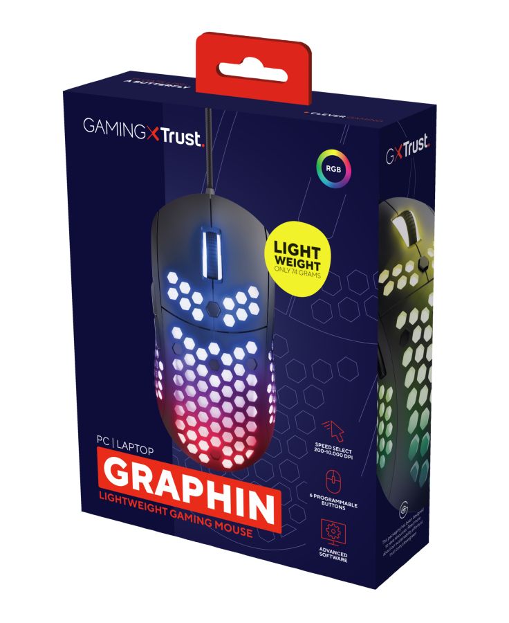 Il Trust GXT 960 Graphin pesa solo 74 grammi e, grazie alla struttura esterna del guscio a nido d?ape, consente una risposta più rapida e ore di gaming in pieno comfort.