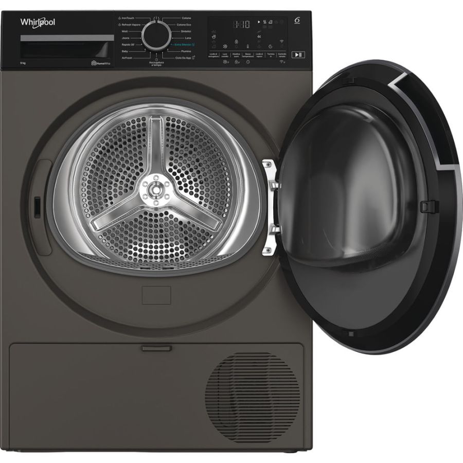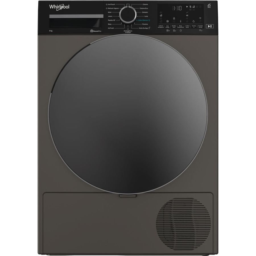 Asciugatrici Whirlpool CWD96MGBSI ASCIUG 9KG A INV DISPL GRIGIA DISPL WIFI ECO161005Caratteristiche di questa asciugatrice a libera installazione Whirlpool: eccezionale capacità del cestello di 9,0kg per non restare mai senza spazio. Esclusiva tecnologia 6° SENSO che monitora costantemente il livello di umidità nel tamburo per proteggere i tuoi vestiti e garantire un'asciugatura perfetta. Funzione di connessione che consente all'elettrodomestico di ricevere informazioni riguardo il ciclo di lavaggio utilizzato e regolare le impostazioni di conseguenza per risultati perfetti. Sportello dal design elegante con schermo di sicurezza. Azione di asciugatura delicata e igienica, che riduce le pieghe e rinfresca i tuoi vestiti.